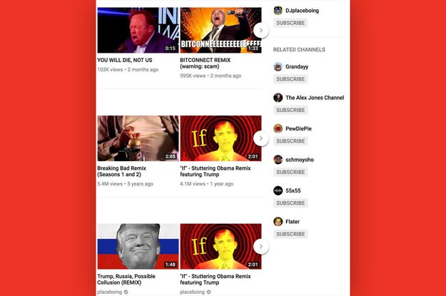 The recommended channels for Placeboing, a YouTuber who makes video remixes and mashups.