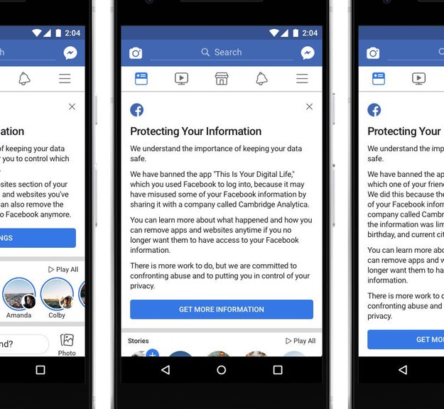 Messages sent to Facebook users whose data was improperly shared with Cambridge Analytica.